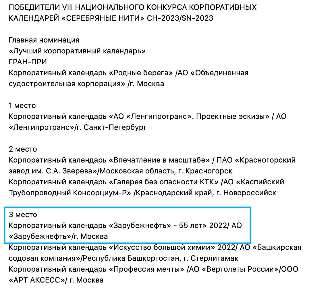 По итогам VIII национального конкурса корпоративных календарей «Серебряные нити» в 2023 году наша концепция заняла 3 место в номинации «Лучший корпоративный календарь». И первое место в голосовании участников конкурса.